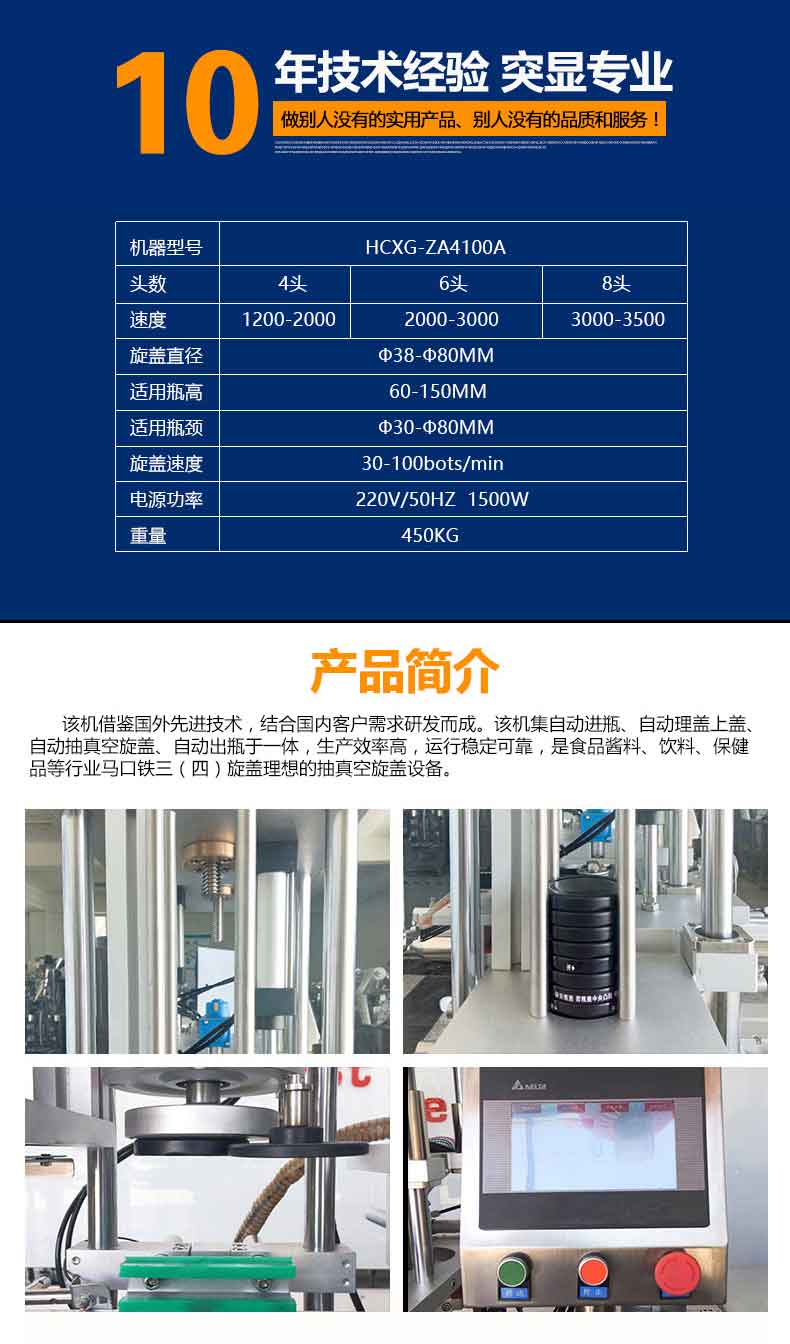 该机借鉴国外先进技术,结合国内客户需求研发而成。该机集自动进瓶、自动理盖上盖、自动抽真空旋盖、自动出瓶于一体,生产效率高,运行稳定可靠,是食品酱料、饮料、保健品等行业马口铁三(四)旋盖理想的抽真空旋盖设备。