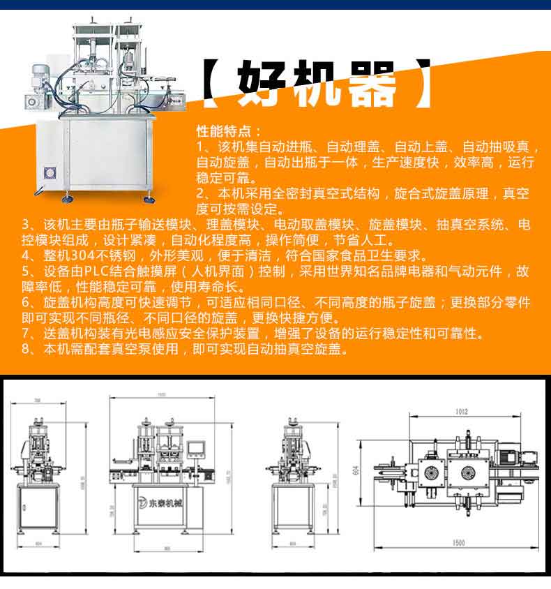 1.该机集自动进瓶、自动理瓶、自动上盖、自动抽真空、自动旋盖、自动出瓶于一体,生产速度快,效率高,运行稳定可靠。