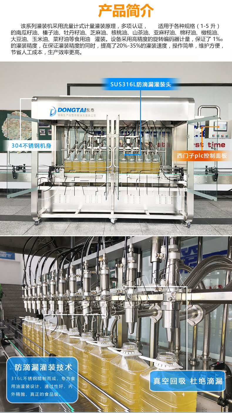 该3000瓶食用油灌装机采用流量计式计量灌装原理,多项认证,适用于各种规格(1-5升)的南瓜籽油、榛子油、牡丹籽油、芝麻油、核桃油、山茶油、亚麻籽油、棉籽油、橄榄油、大豆油、玉米油、菜籽油等食用油灌装。设备采用高精的旋转编码器计量,保证了1%o的灌装精度,在保证灌装精度的同时,提高了20%-35%的灌装速度,操作简单,维护方便,节省人工成本,生产效率更高。