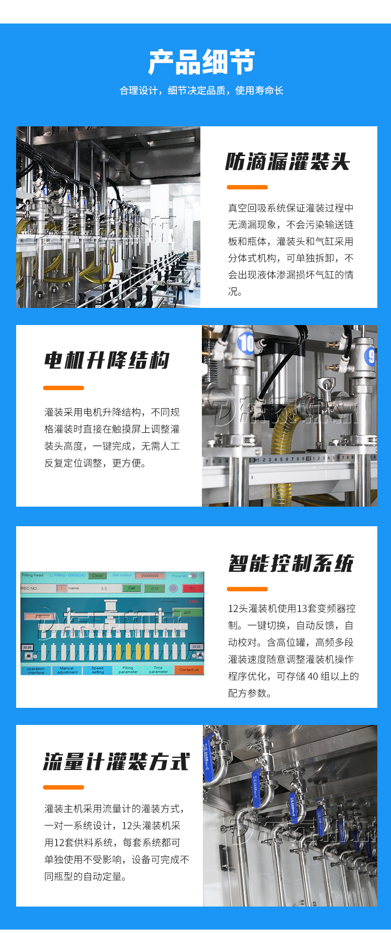 泡等);灌装头整体上升方式平稳,不产生震动,高度及宽度可调;