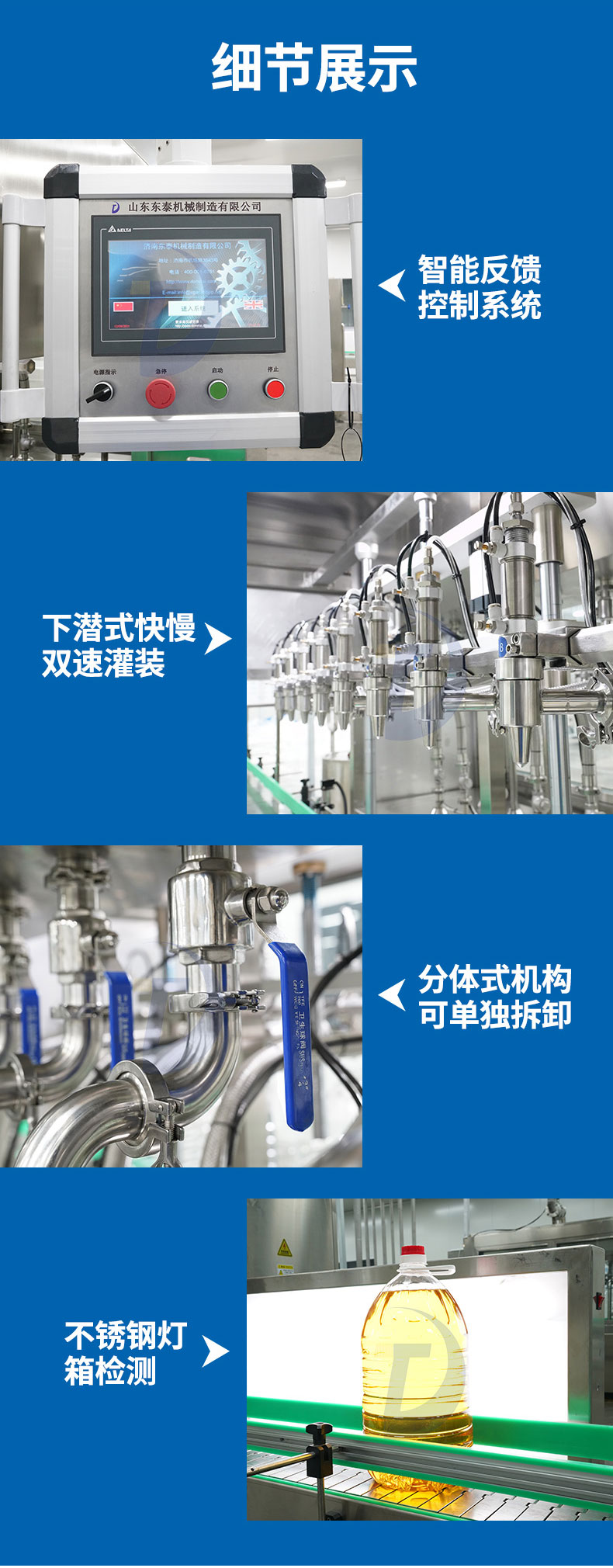 山东东泰机械制造有限公司是小包装油类包装线、软包装油类灌装机、溶液灌装机、填充机及后段包装设备、工业机器人等产品专业生产加工的公司,拥有完整、科学的质量管理体系。 山东东泰机械制造有限公司的诚信、实力和产品质量获得业界的认可。 欢迎各界朋友莅临参观、指导和业务洽谈。