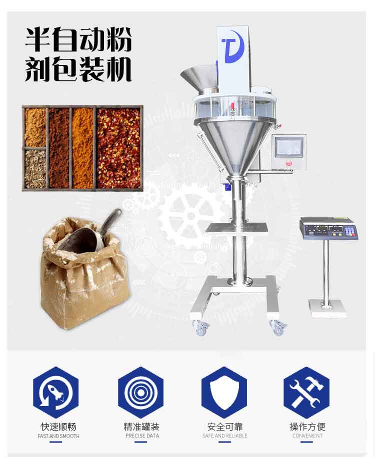 该半自动粉剂包装机也可称为粉剂定量包装机是按照国家GMP标准而设计,集机、电、光、仪于一体,单片机控制, 具有自动定量、自动充填、重量超差报警、自动调整计量误差等功能,精度高、速度快、扭距大、寿命长。电子传感控制称重反馈,对包装容器不限制,适合物料品种和包装重量规格经常变化的场合使用;数码管显示,操作简单方便;各种产品调整参数、配方可储存,最多可储存10个配方;不锈钢和有机玻璃组合式料箱,无需工具即可方便拆洗。