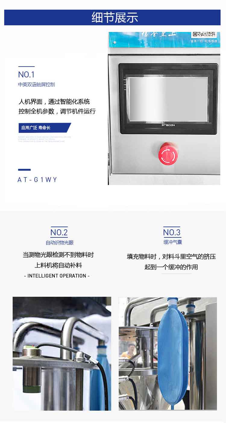 4、包装范围宽:同一台定量包装机在5-5000g内通过电子秤键盘调整及更换不同规格的下料螺旋连续可调