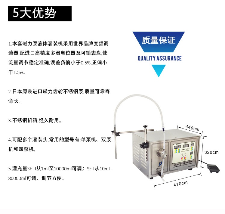 可灌充绝大类型的液体,包括高粘稠度的液体。如:各种药剂、化学品、油类、化妆品、食品等无颗粒状液体;灌装精度高,适合实验室用。