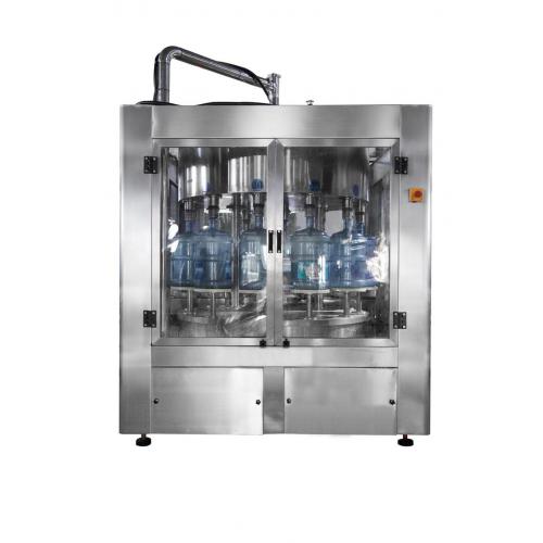 目前灌装机的结构大都是旋转模式,旋转模式就是灌装阀带动包装容器一起做等速回转运动同时进行灌装。灌装机中灌装阀的数目也称灌装机头数。旋转型灌装机的工作原理是液料由旋转分配器送入环形储液箱中,瓶子由瓶输送装置进瓶由拨轮送入到瓶的升降机构上,瓶子在上升的同时绕灌装机回转,当瓶子和灌装阀紧密接触时自动灌装液料,灌装结束后由升降机构送入到水平位置,再由中间拨轮轮送至压盖机上。每当灌装机工作结束时,可自动清洗。旋转型灌装机的结构比较复杂,主要由以下五个部件组成: