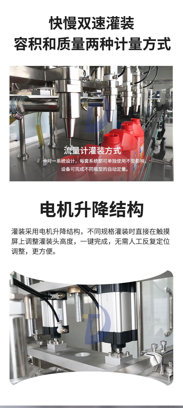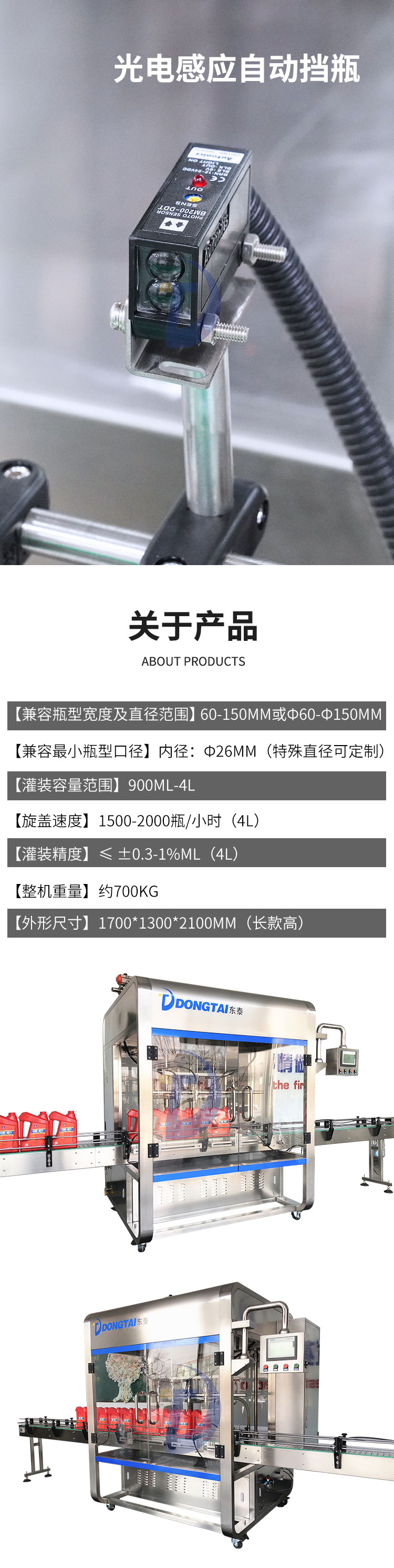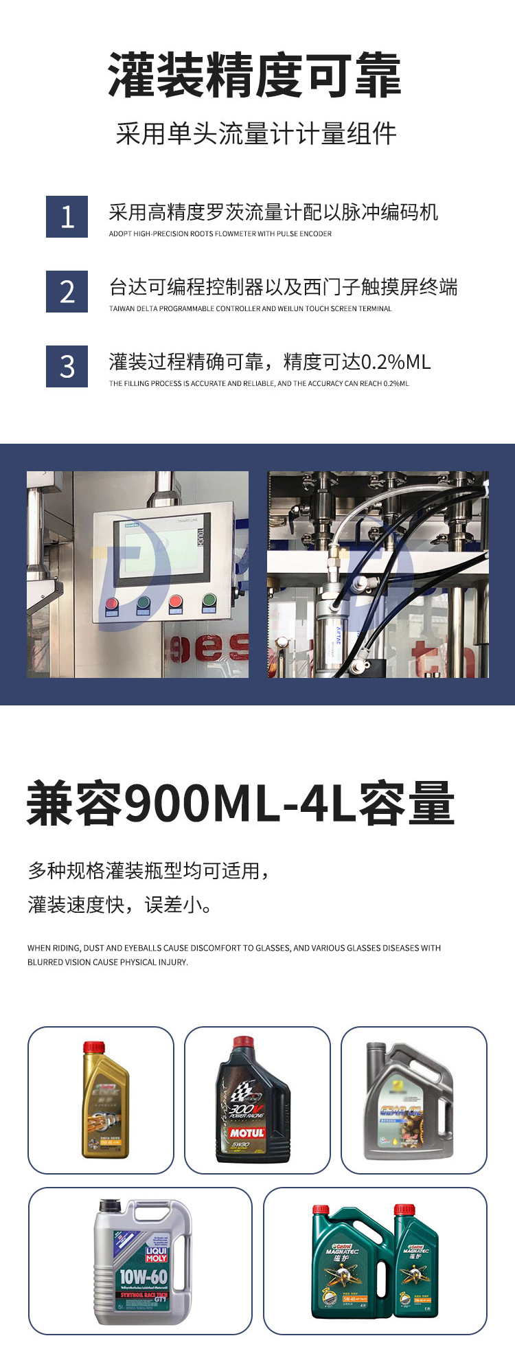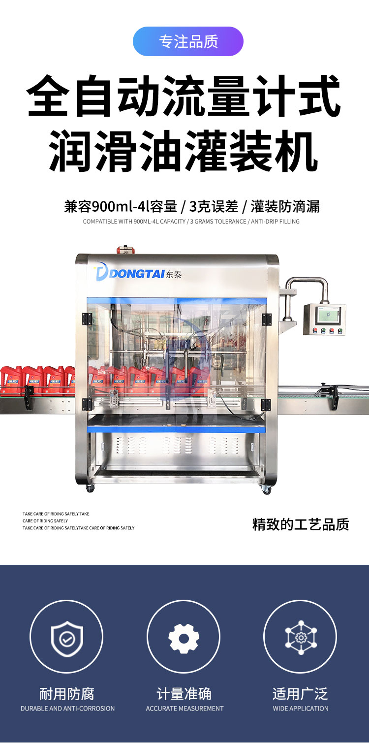 全自动润滑油灌装主机采用流量计的灌装方式,一对一系统设计,4头灌装机采用4套供料系统单灌装主机采用流量计的灌装方式,一对一系统设计,每套系统都可单独使用不受影响,设备可完成不同瓶型的自动定量;灌装头自带回吸功能,防止油品外溢,灌装机顶部带有储料箱,储料箱内部免存料设计,储料箱内要有高、低液位装置,高、低液位信号要求是24V、4~20mA,由接线端子输出。