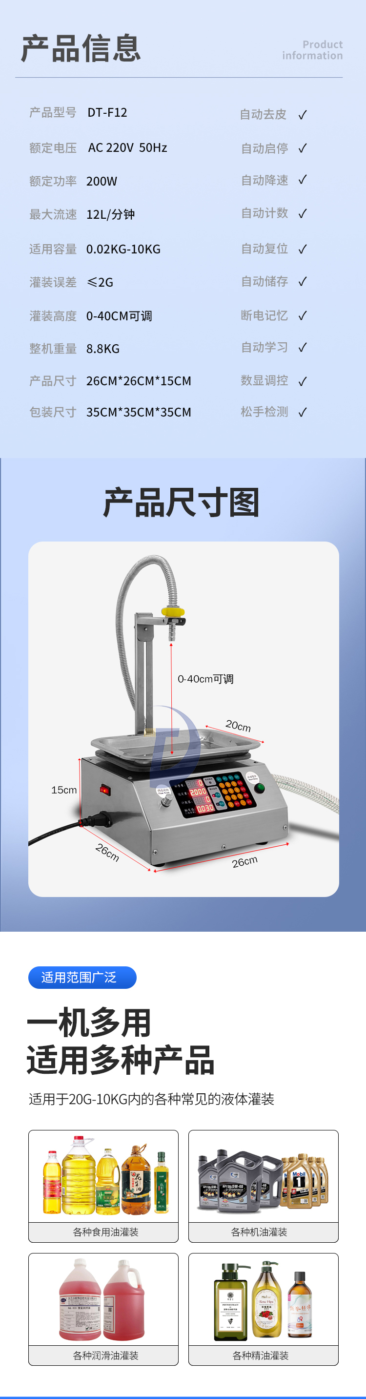 称重式智能灌装机 一机多用 适用多种产品 适用于30g-15KG内的各种常见液体灌装,例如:各种食用油、玻璃水、洗衣液、酱油醋、各种饮料等。