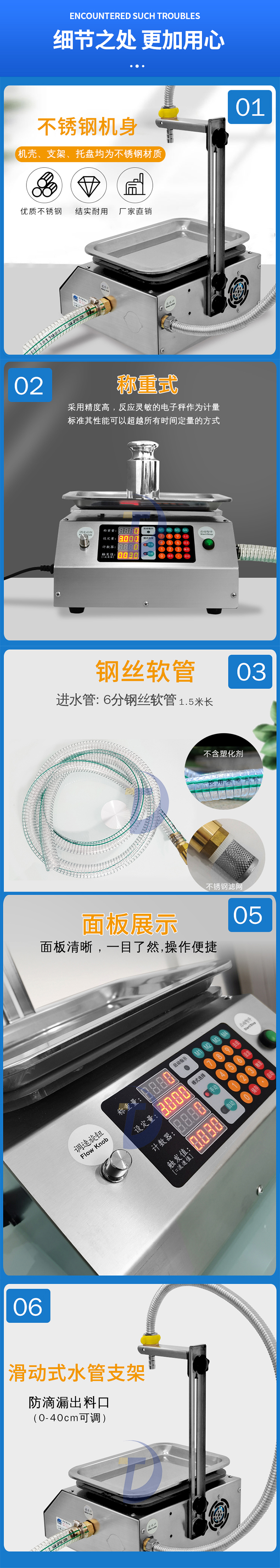 采用反应灵敏的电子秤作为计量准确,滑动式水管支架,防滴漏出料口。0-40cm可调,符合生产加工需求。